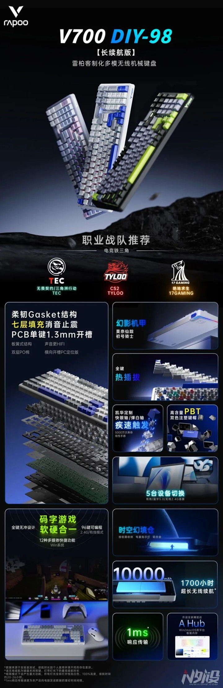 告别续航焦虑,机械键盘体验全方位进化。雷柏V700DIY-98长续航版客制化多模无线机械键盘,以单次满电可连续使用1700小时为核心突破,融合7层消音Gasket结构带来的纯净HIFI按键声效,提供两种疾速触发机械轴体,支持三模多设备连接,为游戏玩家与办公用户提供持久、干净无杂音、多设备协同的无线客制化解决方案。