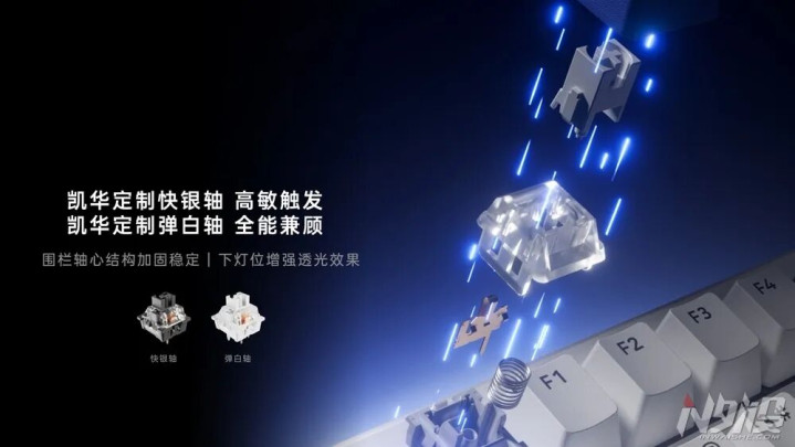 在手感上细分人群,针对不同人群,为玩家推出了两种手感轴体选择。面向高敏玩家,提供了约35g触发力度,1.2±0.4mm触发行程的凯华定制快银轴;针对想要兼顾游戏与打字场景的玩家,提供了约40g触发力度,1.5±0.5mm触发行程的凯华定制弹白轴。并且在轴体的围栏轴心结构上加固稳定,提升强劲回弹,疾速触发的线性手感,带来极致顺滑的体验。键帽材质上则采用含量更高的PBT双色注塑键帽,以及三款配色选择:初号骑士版、莫奈仙踪版、幻影机甲版。不仅色彩鲜艳,经久耐用,使用感上亦更舒适。
